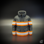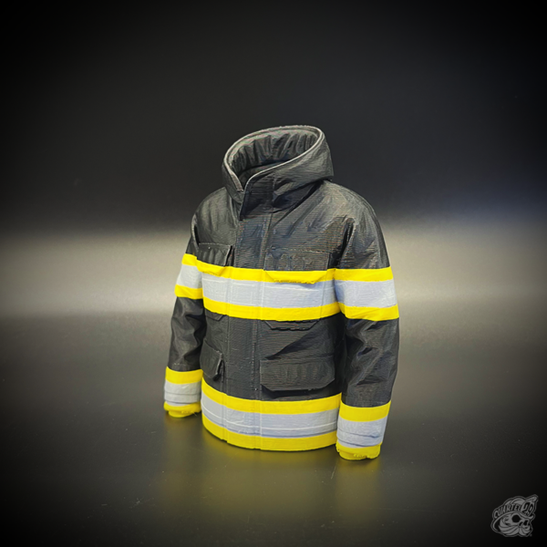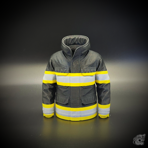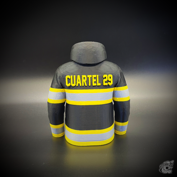 Lapicero con diseño de chaqueta de bombero, fabricado en PLA mediante impresión 3D.